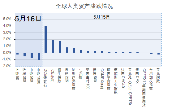 股指方面,5月16日主要指数均缩量收阴,其中大盘股指数表现好于中小盘。K线形态方面,主要股指均走出了实体阴线,但长度相对较短,结合沪深300、中证500指数此前出现的底背离迹象,我们仍认为短期内指数有一定的反弹空间。