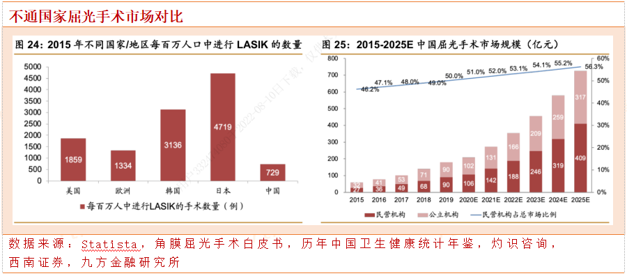 屈光手术的普及率有望在中国实现快速提升。2015年中国每百万人进行激光分子手术的数量仅为729例,仅为日本的15%,美国的40%。随着人均收入的不断提高、人们对眼健康的关注以及手术方式进步带来的消费升级,未来屈光手术有望在中国实现快速增长。
