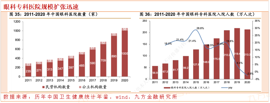 眼科专科医院的数量增长迅速。随着眼病发病率逐年攀升、眼健康意识不断增强、支付能力提升等多重因素影响,眼科刚需不断增加。2011年我国眼科专科医院共计288家,入院患者56.9万人,2020年我国眼科专科医院达1061个,年均复合增速为15.6%,患者入院人数达213.3万人,年复合增长率15.8%。