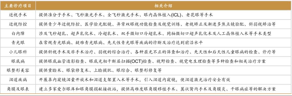 公司作为专业眼科连锁医疗机构,主要从事各类眼科疾病诊疗、手术服务与医学验光配镜,目前医疗网络已遍及中国大陆、中国香港、欧洲、美国、东南亚,奠定了全球发展的战略格局。