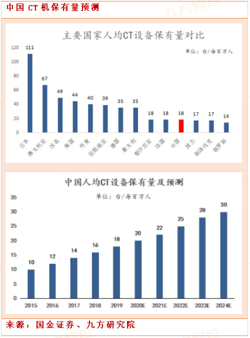 CT市场渗透率较低,提升空间巨大。目前,中国的CT设备人均保有量仅为每百万人拥有18台。相比之下,美国每百万人拥有CT设备44台,是中国的2.5倍;日本每百万人拥有CT设备高达111台,是中国的6倍。我国的CT人均保有量与发达国家存在较大差距,在产品销售上拥有较大发展空间。预计到2024年,我国CT设备人均保有量将增长至30台/每百万人。
