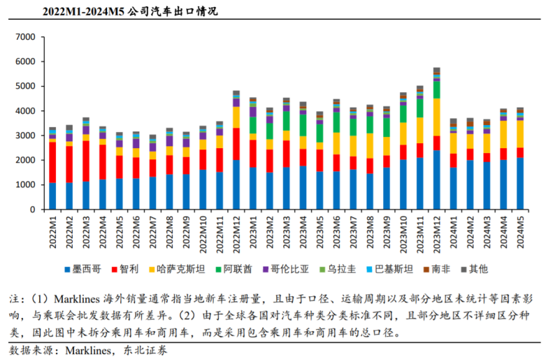 从海外销售国家或地区来看,公司的汽车产品(包含乘用车和商用车)主要销往美洲(墨西哥、智利、哥伦比亚)、中亚(哈萨克斯坦)、中东(阿联酋)等,且乘用车、皮卡、轻卡在海外均有较好的销售表现。