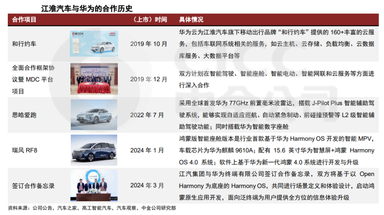 加入华为智选阵营,双方强强联合、优势互补,有望实现高端化新能源突破。公司与华为在2019年就签署了合作框架协议及MDC平台合作协议,双方的合作随着2023年12月《智能新能源汽车合作协议》的签署而进一步加深。江淮在先进制造方面具备优势,华为在用户领域拥有打造高端产品的成功经验,并且能够从产品定义、宣传营销、销售渠道等多方面进行赋能,二者发挥各自的强项,有望为鸿蒙智行阵营再添增量,也将带动江淮汽车向中高端新能源领域进军。