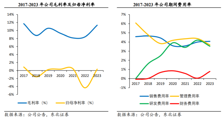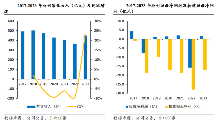 从利润端看,2017-2023年间公司归母净利润处于盈亏波动的状态,主要受到疫情