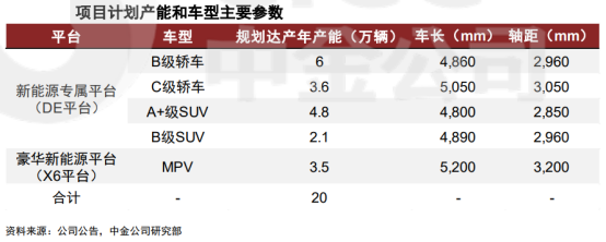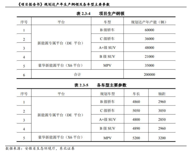 2024年3月初,安徽省生态环境厅公示了《江淮年产20万辆中高端智能纯电动乘用车建设项目环境影响报告书》(下称“项目报告书”),项目规划了年产20万辆纯电动(含增程式)乘用车,产品主要为中大型纯电DE、X6平台产品,其中DE纯电平台为新能源专属平台,主要满足国内经济型和改善型市场需求,产品覆盖B级轿车、C级轿车、A+级SUV和B级车型;X6纯电平台为豪华新能源平台,覆盖车型级别为中大型MPV车型,通过华为智能技术赋能,积极抢占国内高端市场。