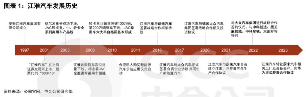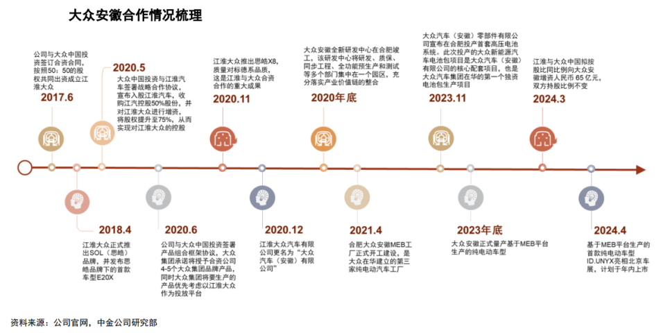 与大众的合作中,二者成立了合资公司江淮大众,投入运行后发布了新能源品牌思皓。随着合作的不断深入以及相关增资活动,合资公司更名大众(安徽),研发中心也顺利启用,纯电动车型CupraTavascan于2023年12月启动生产、主要面向欧洲市场,此外,合资公司面向国内的首款新能源车型ID.UNYX与众近期也出现在工信部公告中,定位A级纯电SUV。在与蔚来、大众等优质车企合作过程中,公司积累了合作经验,提升了先进制造能力,为后续进一步发展以及新能源转型奠定了良好的基础。