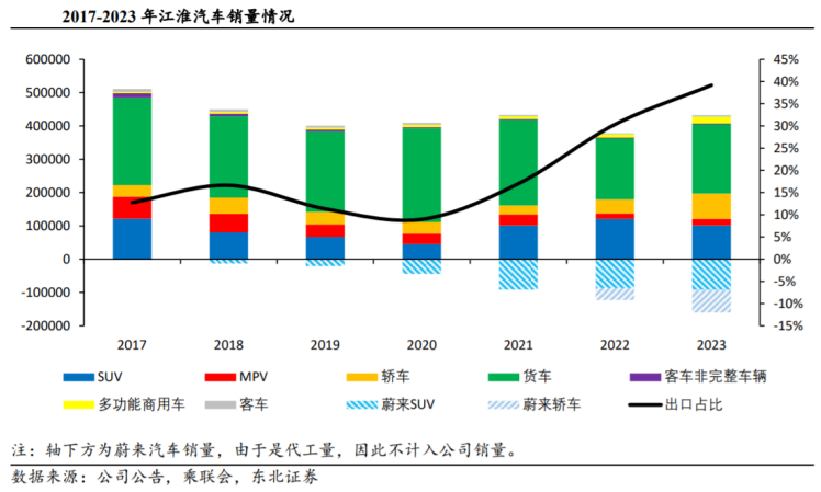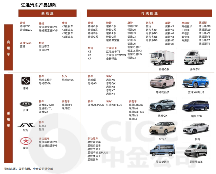 安徽江淮汽车集团股份有限公司始建于1964年,历经数十年的发展已成为一家集商用车、乘用车及动力总成研发、制造、销售和服务于一体的综合型汽车厂商,公司产品主要是整车和客车底盘,其中整车产品分为乘用车和商用车,乘用车包括SUV、轿车、MPV等产品,商用车包括轻型货车、重型货车、多功能商用车、客车等产品,零部件方面,覆盖传统燃油车和新能源产品。公司近年来销量较稳定,乘用车销量逐年增长,同时持续拓展海外市场,出口改善销量结构。