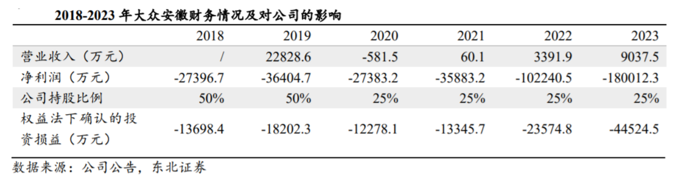 大众安徽相关车型开启量产,有望增厚投资收益。根据公司公告,大众安徽首台预量产车型已于2022年12月下线,2023年12月正式投产出口欧洲市场的纯电动车型CupraTavascan,面向国内市场的ID.UNYX计划2024年7月上市。大众安徽为大众集团在华第三极,我们认为大众安徽为大众集团智能电动化进程上的重要参与者,公司持有大众安徽25%股份,随着大众安徽车型不断发布与量产,公司有望持续受益。