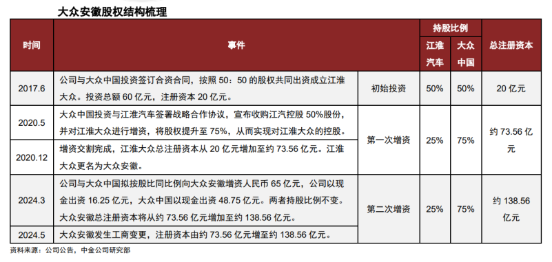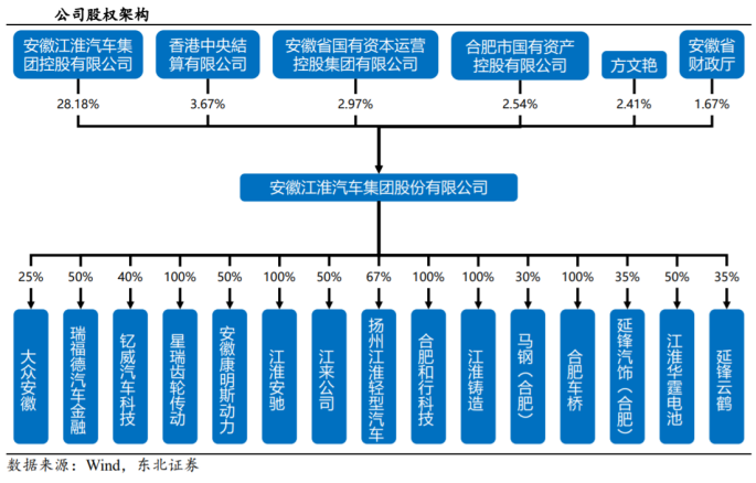 公司为一家国有企业,第一大股东为安徽江淮汽车集团控股有限公司、持股28.18%,安徽省国有资本运营控股集团有限公司、合肥市国有资产控股有限公司、安徽省财政厅分别持股2.97%、2.54%、1.67%。公司积极投资参股控股多家公司,包括大众安徽、江来公司等合资公司,以及行业相关产业链公司。
