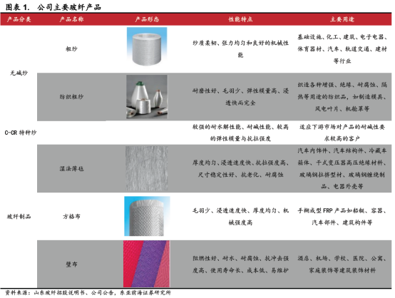 山东玻纤:公司主要涵盖玻璃纤维生产及其初加工以及热电产品两大主营业务。其中玻璃纤维产业是山东能源集团新材料产业重要板块、临矿集团三大支柱产业之一。公司目前共有6条生产线,玻璃纤维设计产能41万吨,位居全国第四、全球第六,客户市场遍布全国31个省市自治区并远销欧美、日韩等国家和地区。