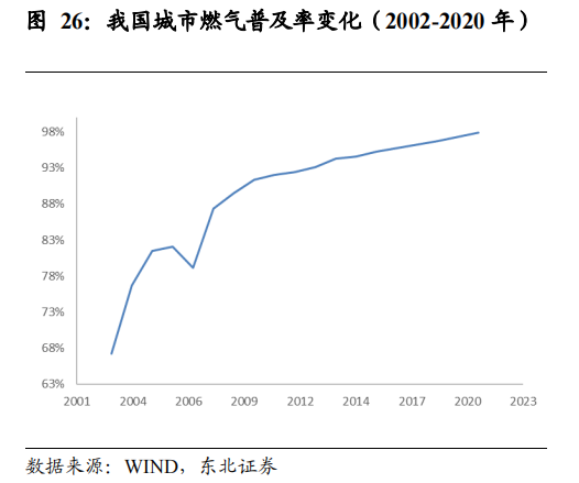 另外,城镇燃气也是我国天然气消费结构中重要部分。进入21世纪,我国城市燃气普及率不断提升,从2002年到2020年我国城市燃气的普及率从67%增长到98%,居民天然气消费不断增长。在实现碳达峰的冲刺阶段,预计未来我国天然气消费量将持续增长。到2025年,天然气消费量达到4300亿-4500亿立方米;2030年,天然气消费量达到5500亿-6000亿立方米。