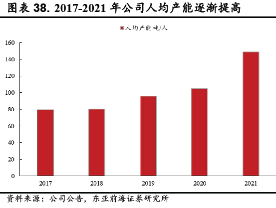 公司持续优化生产效率,单线产能和人均产能逐步提高,近年来通过技改不断优化产线效率。从人均产能来看,由2017 年的79.4吨/人提升至2021年的148.66吨/人。