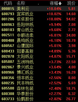 截至发稿,美利云、宜宾纸业、岳阳林纸等4股涨停,青山纸业、中顺洁柔、晨鸣纸业等多股纷纷跟涨。
