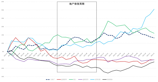 在2012年房地产复苏周期内,房地产销售于2月见底,房价于5月见底,房屋市场的量领先于价。新开工于7月见底,投资于10月见底。在2015年房地产复苏周期内,销售于2月见底,房价和新开工于3月见底,投资于12月见底。