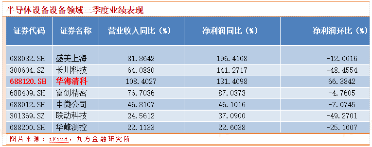 设备企业三季度营收与净利润同比绝对增速依然是半导体行业中较高的领域,不过值得注意的是三季度环比增速表现一般,仅华海清科三季度净利润环比增长。