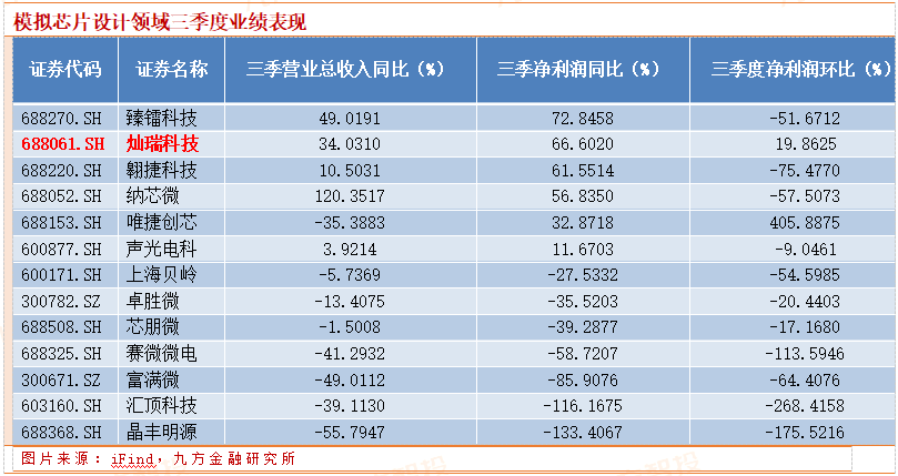 模拟芯片设计领域营收、净利润同比及环比大面积下滑,仅灿瑞科技三项指标均上涨。