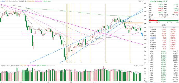 日线级别来看,今日中阴线调整之后,短期支撑位在下方60日均线处,也即是3243位置,下周初,即便是指数再下探,下方空间也不大,反而越是靠近3226附近位置,越要敢于低吸(极限支撑看3200点整数关口)。