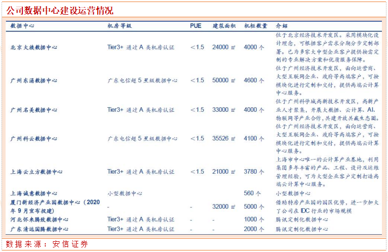 根据公司半年报,截至2021 年6 月末,公司在北、上、广等地拥有7 个大型自建数据中心,拥有运营机柜数约2.9 万个。公司数据中心总建筑面积超过20 万平方米,现已形成华北、华东、华南、西南四大数据中心集群。