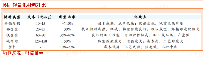 轻量化的技术方向包括:材料的轻量化、工艺的轻量化、结构的轻量化。目前汽车轻量化材料有高强度钢、铝合金、镁合金、塑料、碳纤维等,当前钢铁在汽车总重中占比超过50%,铝合金用量将大幅增长。在各类轻量化材料中,铝合金的成本仅高于高强度钢,但远低于镁合金和塑料及碳纤维。
