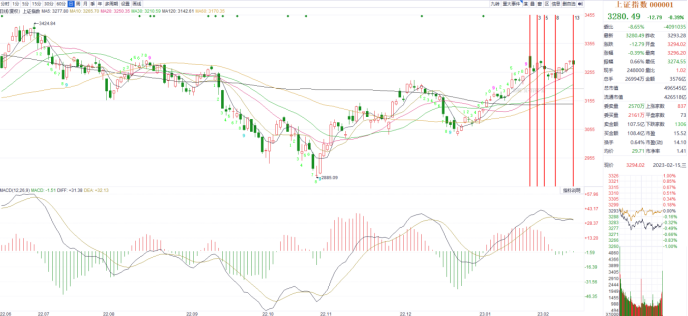 2)沪指自3310调整以来,将于本周三迎来第13个交易的变盘窗口,若选择直接收阴,则macd指标易确认反凹形态。