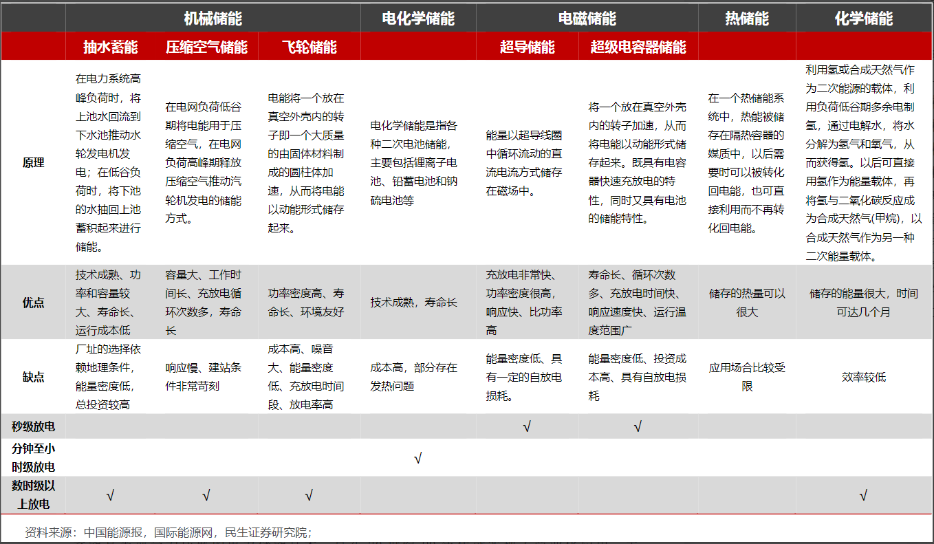 电磁储能主要包括超导储能、超级电容器存储能等方式。热储能主要包括储热、储冷等方式。化学储能包括电解水制氢、合成天然气等方式。