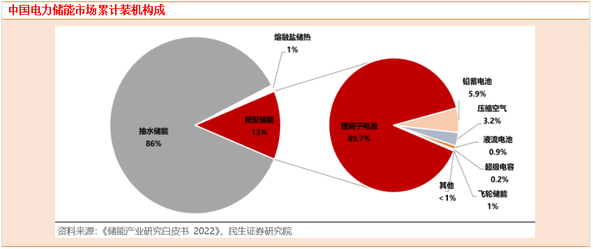 电化学储能主要分为铅酸电池、铅炭电池、锂离子电池、钠离子电池、钠硫电池、液流电池等六类。截至2021年,在国内电化学储能市场中,锂离子电池占据绝对主导地位,市场份额达到89.7%。