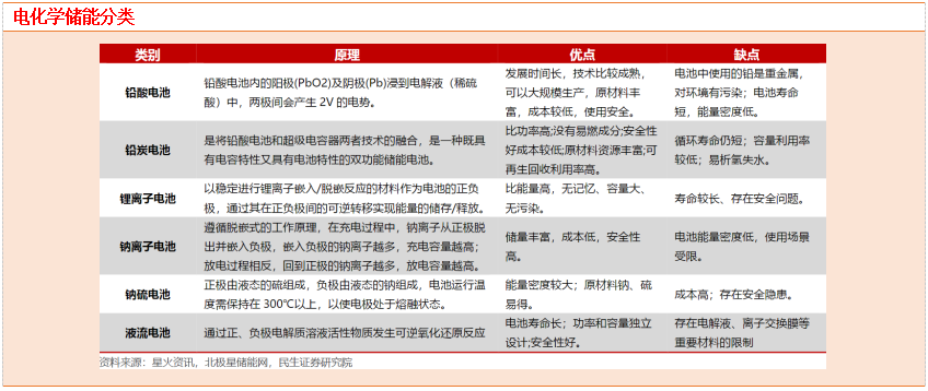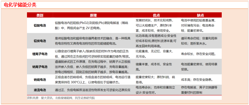 储能的技术路径主要可以分为机械储能、电化学储能、电磁储能、热储能、化学储能等方式。其中,机械储能主要包括抽水蓄能、压缩空气储能和飞轮储能等;电化学储能是指各种二次电池储能,主要包括铅酸电池、铅炭电池、锂离子电池、钠硫电池、钠离子电池等。
