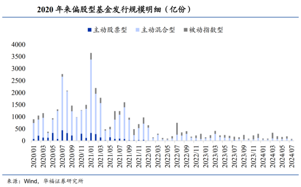 股型基金发行和市场表现(特别是核心资产)高度相关,例如在2020年下半年随着全球央行纷纷采取宽松的货币政策,权益市场表现非常亮眼,偏股型基金发行同样水涨船高,成为市场重要的增量资金来源,2021年1月偏股型基金共计发行3652亿份。但是2021年初之后,随着行情的回落,公募基金发行逐渐低迷,截至今年7月份偏股型基金发行规模仅为78亿份,相比2021年1月份大幅下降98%。
