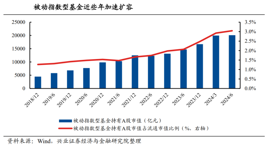 被动基金规模:2023年以来净流入近万亿,当前已突破2万亿。近两年被动基金扩容再提速。被动指数型基金近些年加速扩容,尤其是去年以来增量更为显著。截至2024Q2末,被动指数型基金持有A股的市值已经超过2万亿元,而2018年仅有4466亿元。净流入视角下,2023年以来股票型ETF已经净流入近万亿元,已经成为市场的主导增量之一。