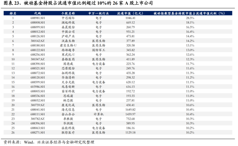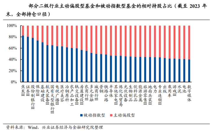 二级行业来看,焦炭、证券、股份制银行、保险、基础建设、航天装备等行业中,被动基金的持股占比均明显高于主动基金。