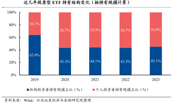 机构与个人近几年均增持股票型ETF,个人投资者当前持仓占比较高。从持有人结构来看,截至2023年末,机构投资者和个人投资者分别持有6486亿元(45.1%)、7894亿元(54.9%)的股票型ETF产品,个人投资者当前的持仓占比较高。