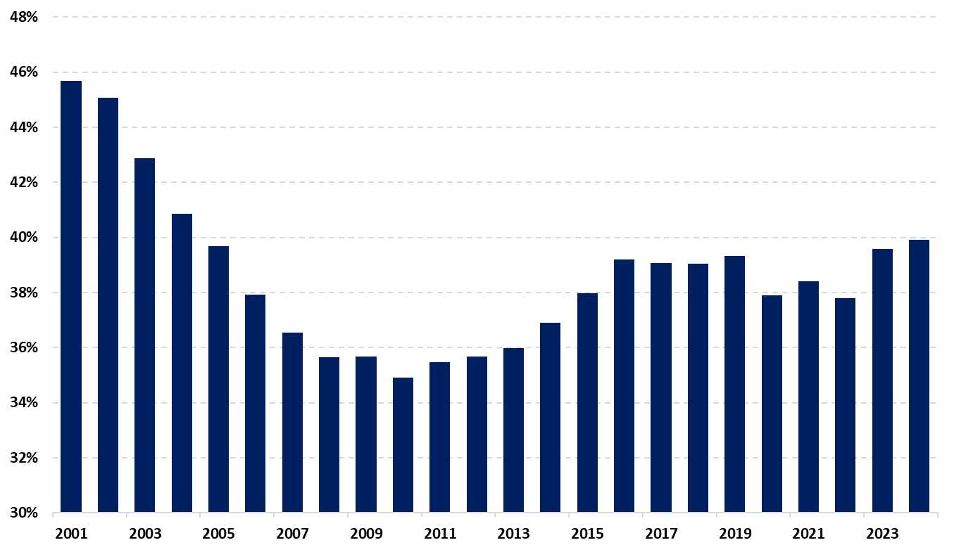 居民消费率提升是历史趋势。居民消费率是居民最终消费与支出法GDP的比值。2024年居民消费率回升至39.9%,已经高于疫情前水平。最新的重要规划建议稿的说明中,直接提及“居民消费率明显提高”。横向比较海外经济体经验,中国当前的居民消费率仍有15%至20%的差距。纵向观察中国居民消费率的历史变化,2000年以来,居民消费率逐年下降,2010年触底后维持在40%下方。未来,在人口和经济转型的双重影响下,劳动报酬比重将稳步提升,居民部门收入占比增加。总需求结构中消费率有望提升,成为经济增长的主要动力。