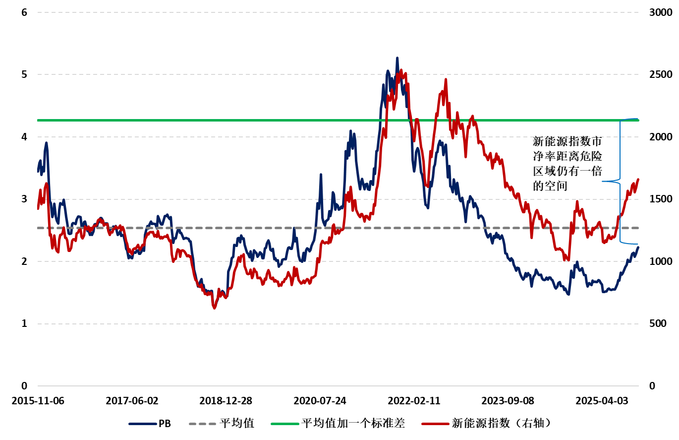 估值与成长推动,新能源板块股价空间巨大。新能源行业在经历2020-2021年高速扩张后,部分环节如光伏组件、锂电池材料出现产能过剩,价格下行,盈利预期下修的现象。2021年后新能源行业估值大幅下降,当前部分细分赛道和龙头企业估值已处于历史低位,今年以来行业景气度回升、政策支持加码,估值存在修复可能,具备中长期配置价值。数据方面,考虑到部分新能源企业处于亏损状态,市盈率无法真实反映新能源的实际价值。我们选用市净率衡量新能源板块的估值。2021年高峰期,新能源板块的市净率一度上升至5倍以上,2025年降至1.5倍,近期上涨后回升至2.2倍,如果回升至历史高位,以市净率衡量的估值将上升100%。即使不考虑当时最疯狂的情况,按照历史数据的平均值加上一倍标准差计算得到危险区间,新能源板块仍处于估值洼地,叠加行业未来数年利润增速有望加快,行业股价未来空间可期。
