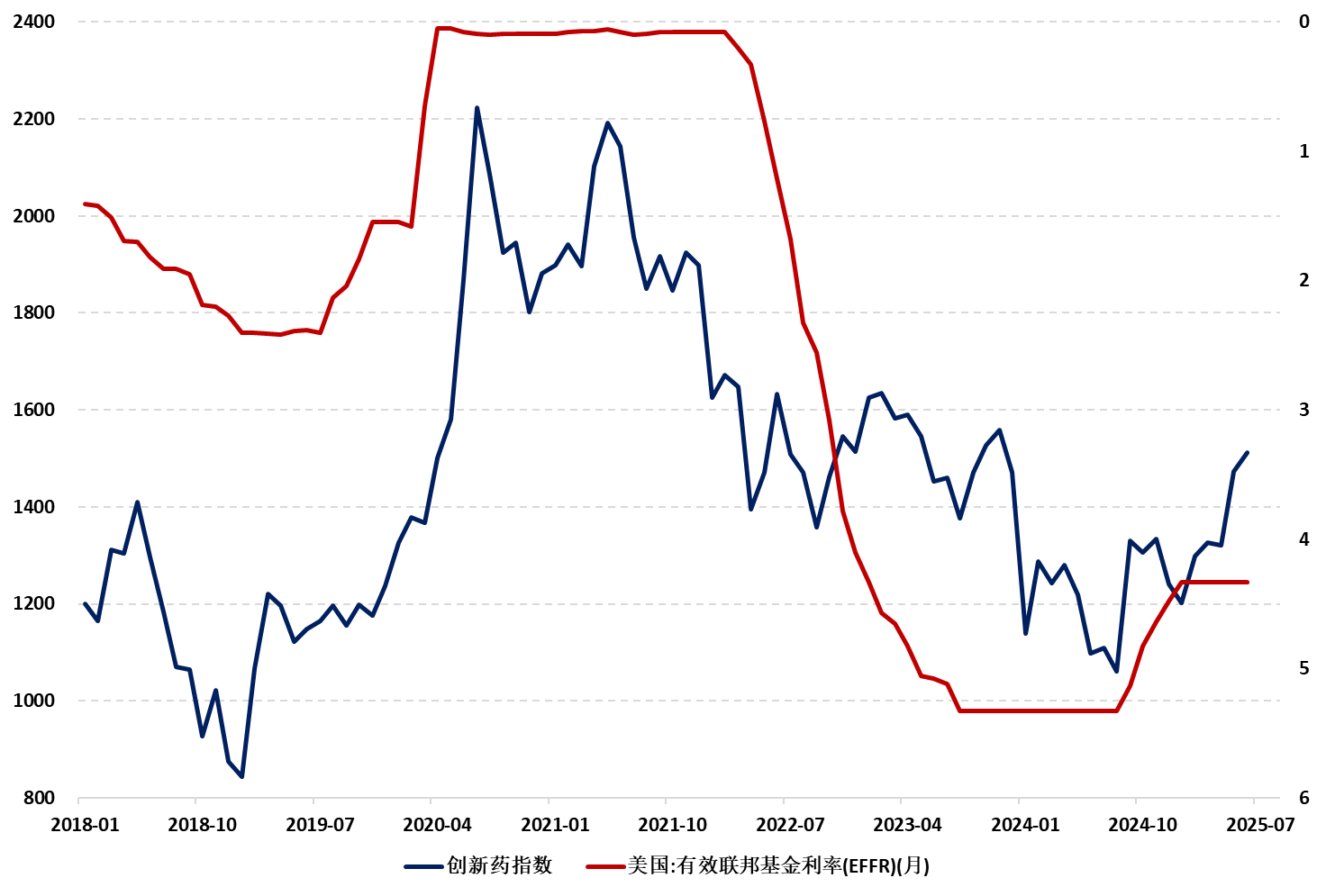 创新药行业迎来三重底后出现趋势性上涨。今年以来创新药行业涨幅排名靠前,三重底夯实股价基础,政策底、业绩底、估值底三者叠加,为行业中期反转提供了较为坚实的支撑。2024年以来创新药全产业链支持政策逐步落地,从政策层面为创新药行业注入活力,形成了全链条支持体系,政策的大力支持使得市场对创新药行业的未来发展充满信心,推动股价上涨。业绩底方面,创新药行业前期研发投入逐渐兑现为业绩,部分企业实现扭亏为盈,板块整体业绩有明显改善。估值角度,美联储降息周期与创新药估值高度相关,2019–2021年降息周期创新药指数市销率从4倍以下升至最高11倍。2022–2024年加息周期内降至最低2倍。2024年年底开始,美联储再次进入降息周期,市销率升至4倍,距离历史高点尚有较长距离。考虑到美联储降息周期有望维持2-3年,创新药行业股价仍然较大空间。