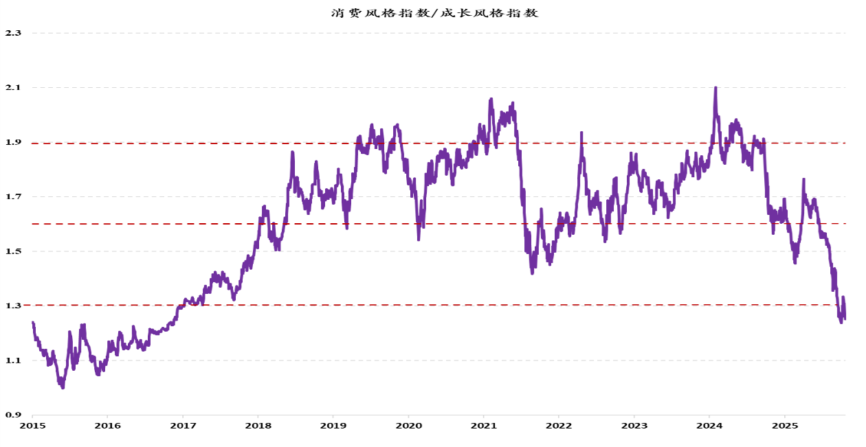 扩大内需相关表述超预期,消费板块当前正处于低位。建议稿的说明中专门提及扩大内需的重要意义,“根据现阶段国内经济下行压力加大、有效需求不足等突出问题,《建议》稿提出居民消费率明显提高、内需拉动经济增长主动力作用持续增强等目标。”国内市场和内需的重要性被提升至前所未有的高度,“十五五”规划将扩大内需确立为战略基点,突出国内大循环在新发展格局中的核心作用。在政策转向内需的同时,消费板块当前正处于历史低位。2025年4月起资本市场出现单边上涨后,大小盘分化并不明显,科技与消费差异较大。中信消费和科技风格指数的比值已经到达历史最低区间。历史上,该比值的平均数在1.6附近,如今降至1.2,仅高于2015年移动互联网热潮引发的科技股泡沫时期。消费股的估值已经存在相对优势。