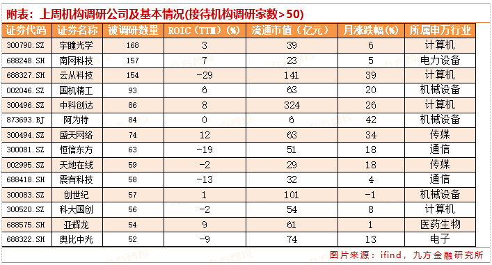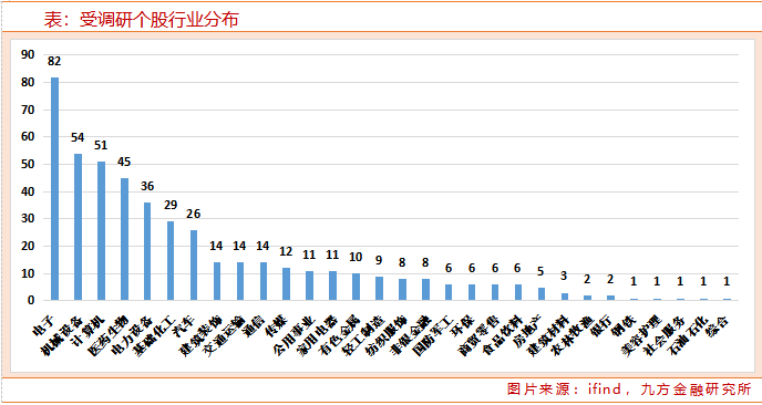 从行业分布来看,本周电子行业有超80家上市公司接受调研,居首;随后为机械设备、计算机行业,有超50家上市公司接受调研。