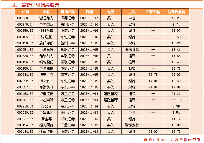 最新评级调高股票方面,有19家公司获得券商调高评级,迪安诊断、科力尔、康缘药业、江海股份获券商给出目标价格。
