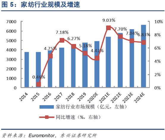 家纺行业的未来是消费升级引领下的渠道和品牌共振,行业仍有较好增速,具备品牌优势和合理渠道布局的公司有望享受行业增长和份额提升。长期看家纺行业增长是消费升级驱动,对品质生活的追求下,对高端家纺品牌的需求在扩大。根据预计,家纺行业目前规模接近5000亿元,未来仍能维持大于5%的高个位数复合增速。