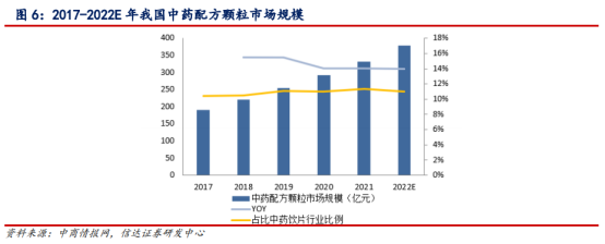 据中商情报网数据显示,我国中药配方颗粒市场规模由2017年的191.6亿元增长至 2020年的291.4亿元,CAGR约15%,占比中药饮片行业比例约为11%。 预计2022年我国中药饮片市场规模或达 3441.5 亿元,中药配方颗粒收入占比有望达到中药饮片的20-30%,约688.3-1032.45亿元,对应数倍扩容的潜力。