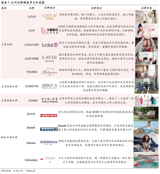 坚持多元化品牌建设,聚焦以床上用品为主的家用纺织品业务,拥有自主品牌罗莱家纺、LOVO、LUOLAI KIDS、LAVIE HOME、YOLANNA,收购品牌LEXINGTON,代理多个国际品牌,拥有良好品牌知名度和美誉度。公司集研发、设计、生产、销售于一体,建设线上线下全渠道销售网络,旗下品牌覆盖多层次市场。