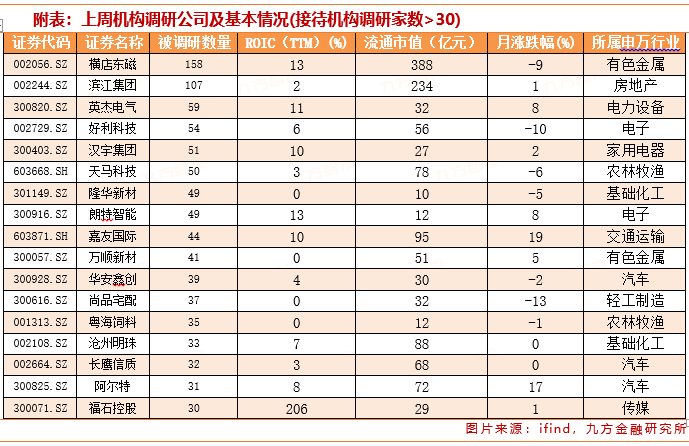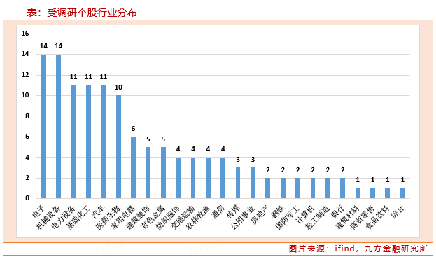 从行业分布来看,上周电子、机械设备行业均有14家上市公司接受调研,居于首位;随后电力设备、基础化工、汽车行业均有11家上市公司接受调研。