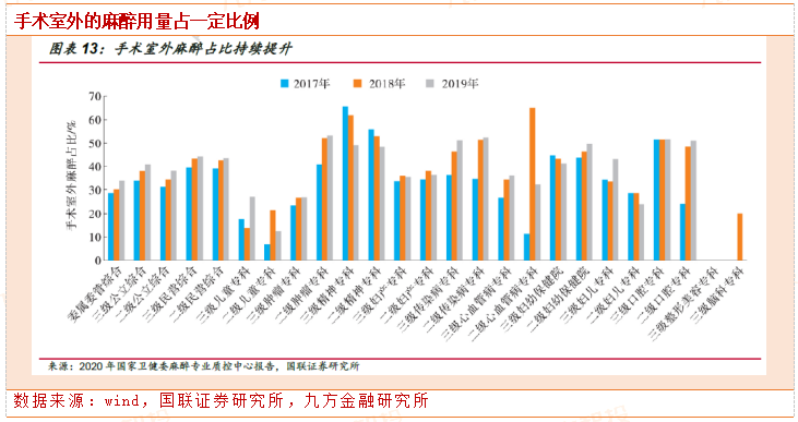 根据《2018年中国医疗质量和技术能力发展报告》,手术室外的麻醉占麻醉手术的比率由2015年的32.6%提升至2017年的34.9%,服务量年复合增速为13.23%。根据2020年国家卫健委麻醉专业质控中心报告,二级、三级公立医院中,2019年手术室外麻醉占比已提升至接近40%的水平。