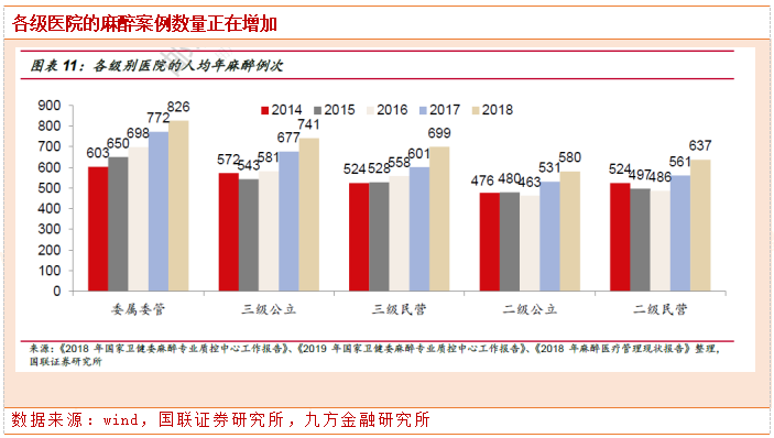 各级别医院的麻醉的人均麻醉量也在逐渐增加。三级公立医院人均麻醉例次由2014年的572例增至2018年的741例次,年均增速达到6.69%,三级民营医院人均麻醉例次由2014年的524例增至2018年的699例,年均复合增速达到7.47%。