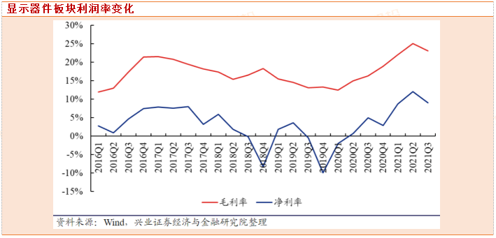 2021年前三季度显示器件板块整体毛利率为23.41%,同比增加8.41个百分点,净利率为9.93%,同比增加8.07个百分点;其中2021Q3板块毛利率为23.14%,同比提升6.78个百分点,环比下降1.94个百分点,净利率为9.07%,同比提升4.07个百分点,环比下降3.01个百分点。