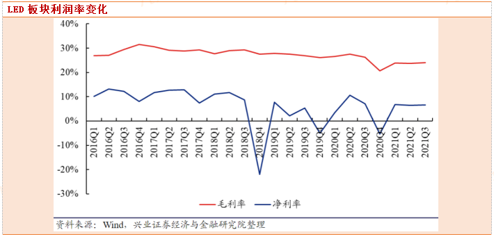 2021年前三季度LED板块整体毛利率为23.88%,同比下滑2.75个百分点,净利率为6.60%,同比下滑0.64个百分点;其中2021Q3毛利率为23.98%,同比下滑2.25个百分点,环比提升0.36个百分点,净利率为6.63%,同比下降0.52个百分点,环比提升0.18个百分点。