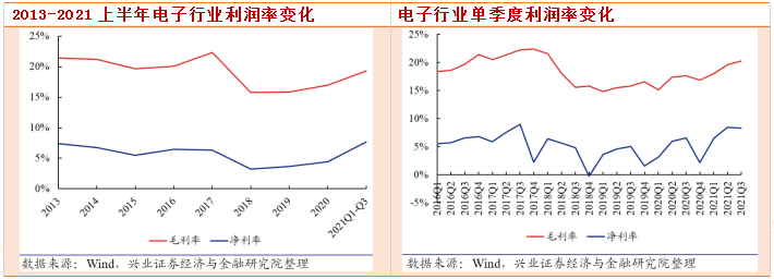 盈利能力方面,芯片等上游产能持续紧张,行业整体毛利率环比提升。2021年前三季度电子行业毛利率和净利率分别为19.35%和7.66%,同比分别提升2.31和2.17个百分点;2021Q3毛利率和净利率分别为20.27%和8.30%,同比分别提升2.66和1.72个百分点。需求和产能缺口持续扩大,高毛利率/净利率的半导体和高端元件受益于国产替代和景气度,业绩增速远高于整体板块,拉高板块利润率。