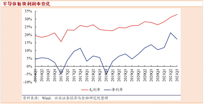 2021年前三季度半导体板块整体毛利率为31.54%,同比提升4.00个百分点,净利率为15.94%,同比提升4.67个百分点;其中2021Q3毛利率为32.98%,同比提升5.06个百分点,环比提升1.77个百分点,净利率为17.29%,同比提升3.51个百分点,环比下降4.08个百分点。