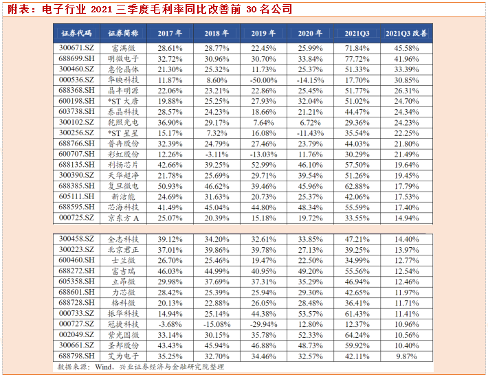截止2021年10月31日,按照申万分类的电子行业上市公司已全部公布2021年三季报: