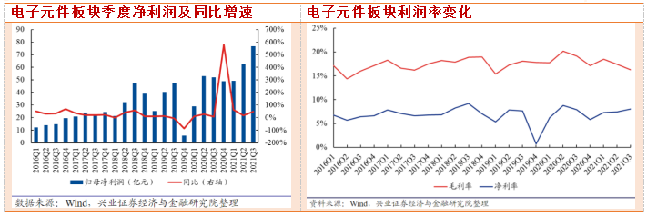 2021年前三季度电子元件板块营业总收入2358亿元,同比增长40.43%,归母净利润190亿元,同比增长38.99%,其中2021Q3营业总收入979亿元,同比增长44.50%,归母净利润76.8亿元,同比增长47.88%。