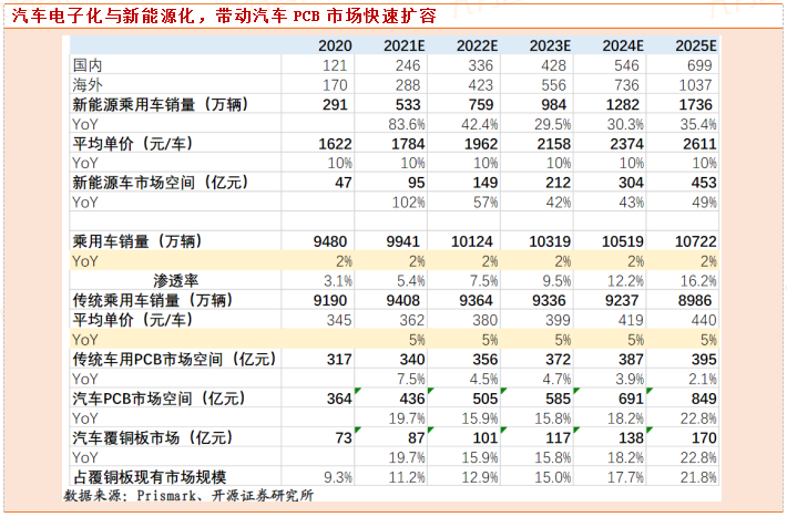 汽车电子化与新能源化,带动汽车PCB市场快速扩容。